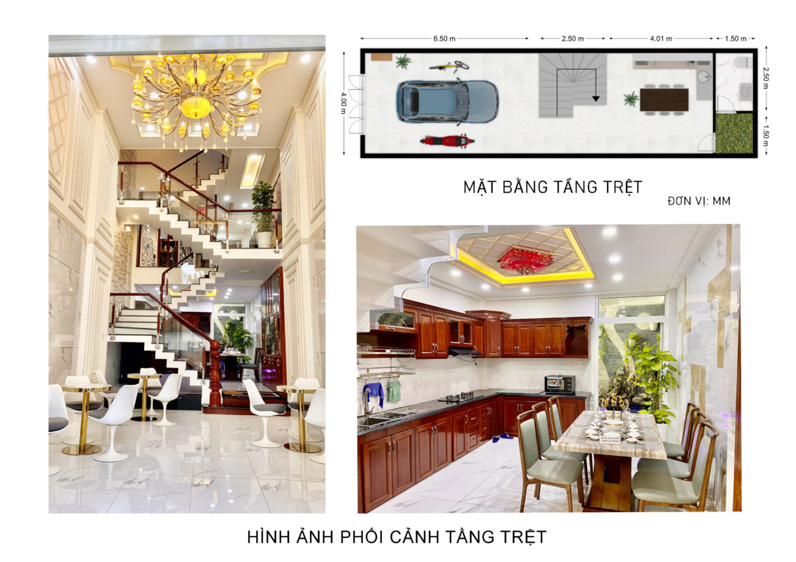 • Tầng trệt được thiết kế thông thoáng với chiều cao gần 6m, có thể bố trí nơi để xe hơi hoặc nơi tiếp khách tùy theo nhu cầu khách hàng.